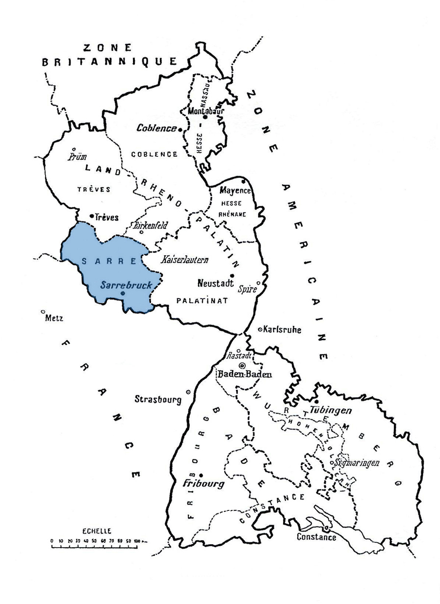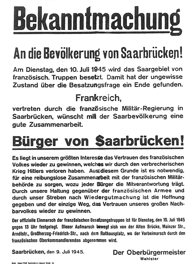 Am 10. Juli 1945 lösen französische Truppen die US-amerikanischen Besatzungstruppen ab; das Saarland ist nun gemäss finalem Zonenprotokoll der European Advisory Commission (EAC) in London für kurze Zeit Teil der französischen Besatzungszone in Deutschland.