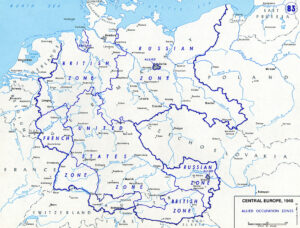 Die französische Besatzungszone umfasst Gebiete im Westen Deutschlands sowie – um die schöne Schweiz herum – das Vorarlberg und die westlichen Teile Tirols in Österreich.