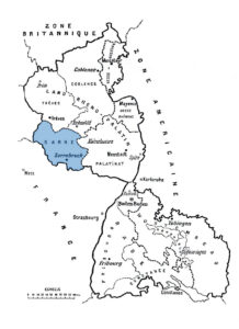 Die französische Besatzungszone in Deutschland ähnelt auf Karten einer Sanduhr, deren Engstelle bei Karlsruhe liegt. Auf der Karte sehen wir die Lage des Saarlandes blassblau eingezeichnet. Die Grenzen des Saarlandes sind nicht die von 1945, sondern jene zur Zeit der grössten territorialen Ausdehnung nach Juli 1946. Thema eines der kommenden Beiträge von Saarphila History ‹Vor 80 Jahren›.